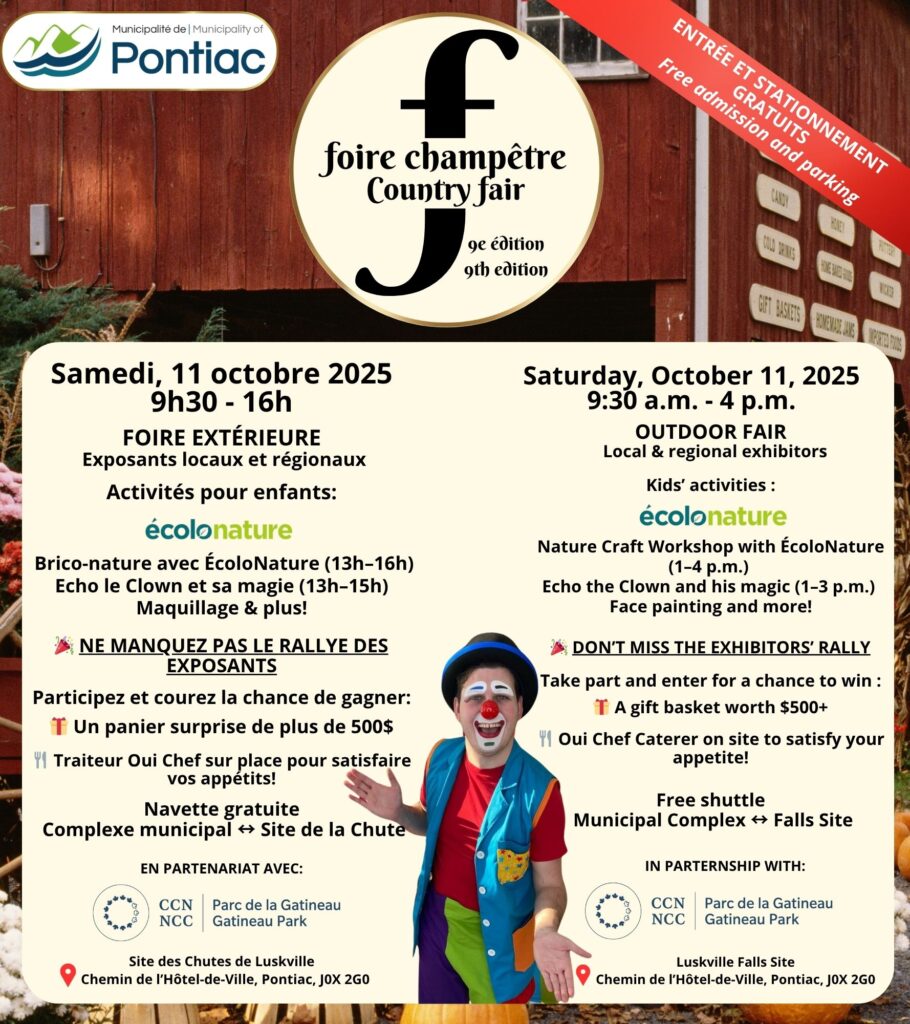 La Foire Champêtre de Pontiac, organisée durant la fin de semaine de l’Action de grâce, célèbre les talents et produits locaux. Avec des activités pour toute la famille, un marché de produits du terroir et des expositions d’artisans, c’est l’occasion parfaite pour passer du bon temps en famille et de faire la découverte de nos artisans locaux.